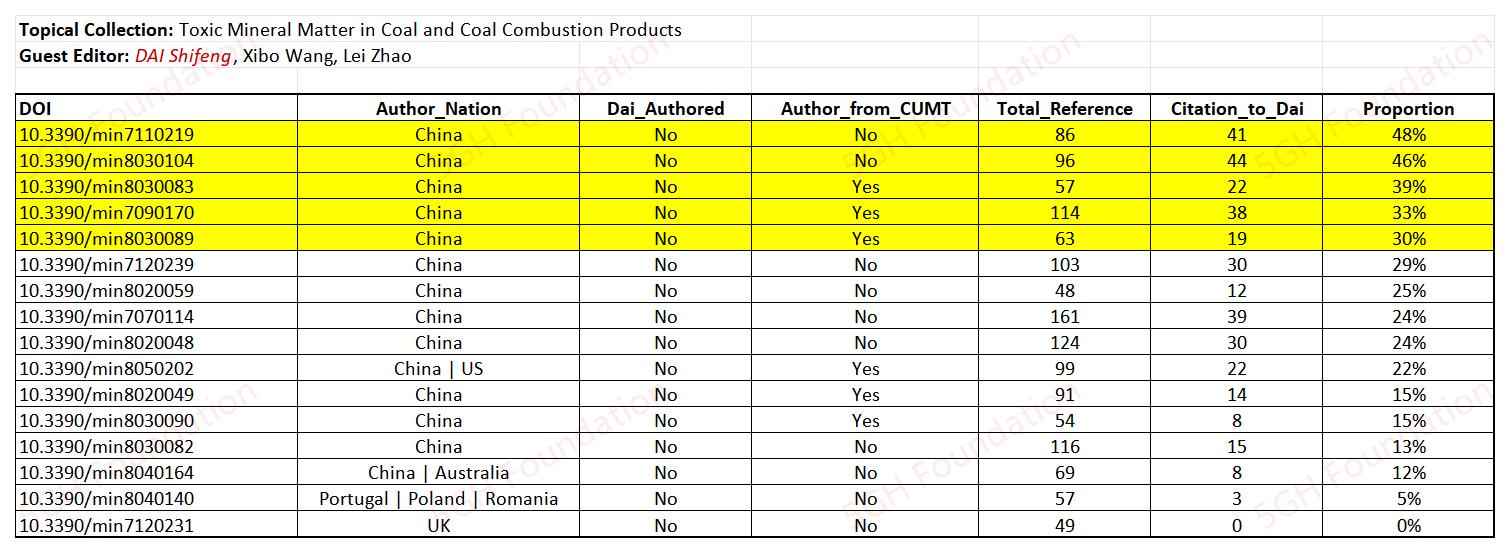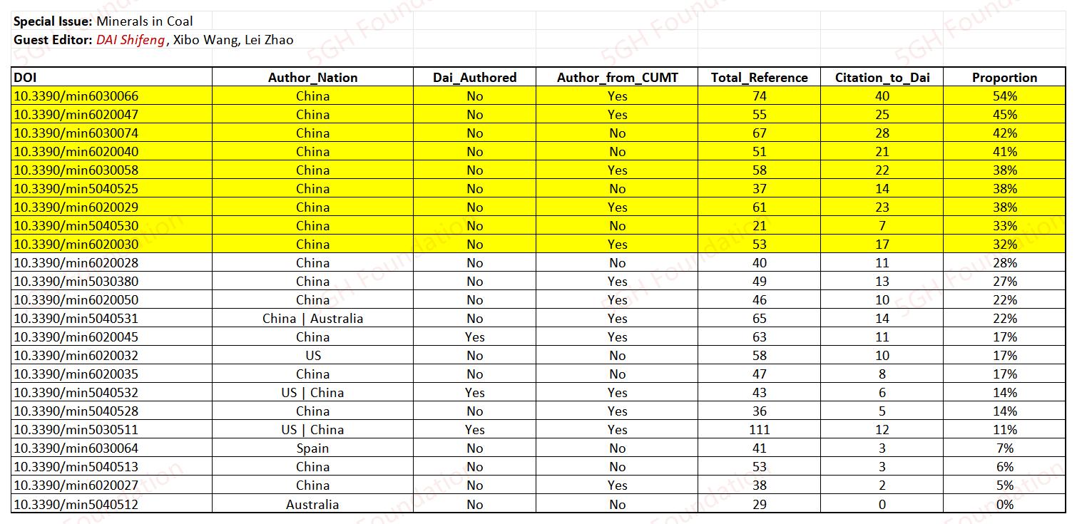 For the special issue "Minerals in Coal", 23 articles were published, from which DAI received a total of 305 citations. Among these 23 articles, 9 articles (approximately 39%) contained more than 30% references co-authored by DAI. The highest proportion was found in article [4], at 54%.